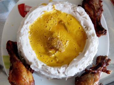 Accompagnement: Plantain vapeur / Tubercules de manioc / Bâton de manioc